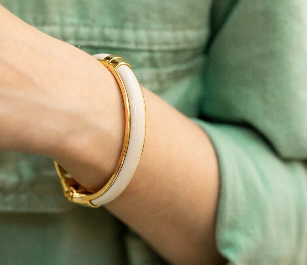 Tamanho largura interna de 58mm, o bracelete oferece conforto e ajuste ideal, sendo uma escolha clássica que realça sua presença com sutileza e charme. Seu design exclusivo, com detalhes em tom off white, confere um acabamento refinado que nunca sai de moda. Ideal para pulsos até 19 cm