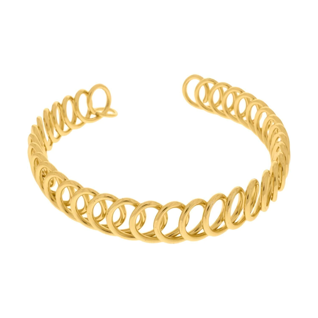 Dê um toque de luxo e sofisticação ao seu visual com o Choker de Mola Dourado. Com um diâmetro de 10,1 cm, esta peça é uma verdadeira obra de design inovador, apresentando molas entrelaçadas que criam uma textura dinâmica e um brilho único.